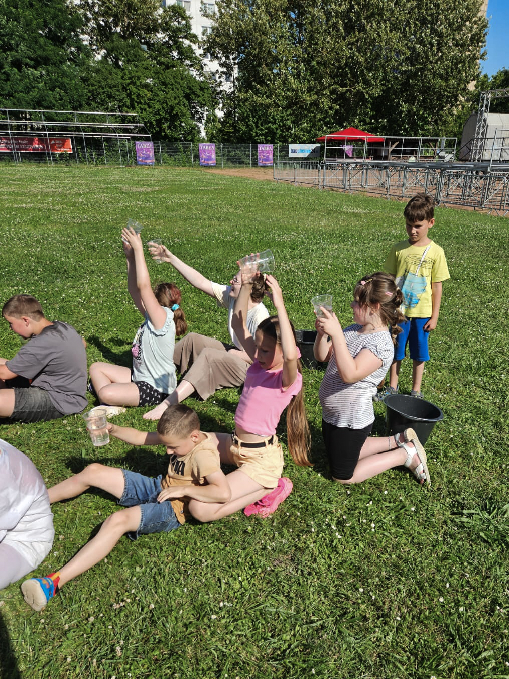 An einem heißen Sommertag sorgten die Wasserspiele für die nötige Abkühlung und jede Menge Spaß. Auf die Becher, fertig, los! Die Kinder stellten ihre Geschicklichkeit unter Beweis, indem sie Wasser aus Bechern rückwärts in andere Becher füllten. Die Nächste Aufgabe: Spritziger Staffellauf. Auch bei diesem Wettkampf blieb kein Kind trocken! Weitere Highlights waren das Zerschlagen von Piñatas aus Luftballons mit Wasser gefüllt und das Werfen von nassen Schwämmen. Das Ergebnis: viele lachende Kinder und eine schöne Abkühlung, auch für die Projektleitung.
