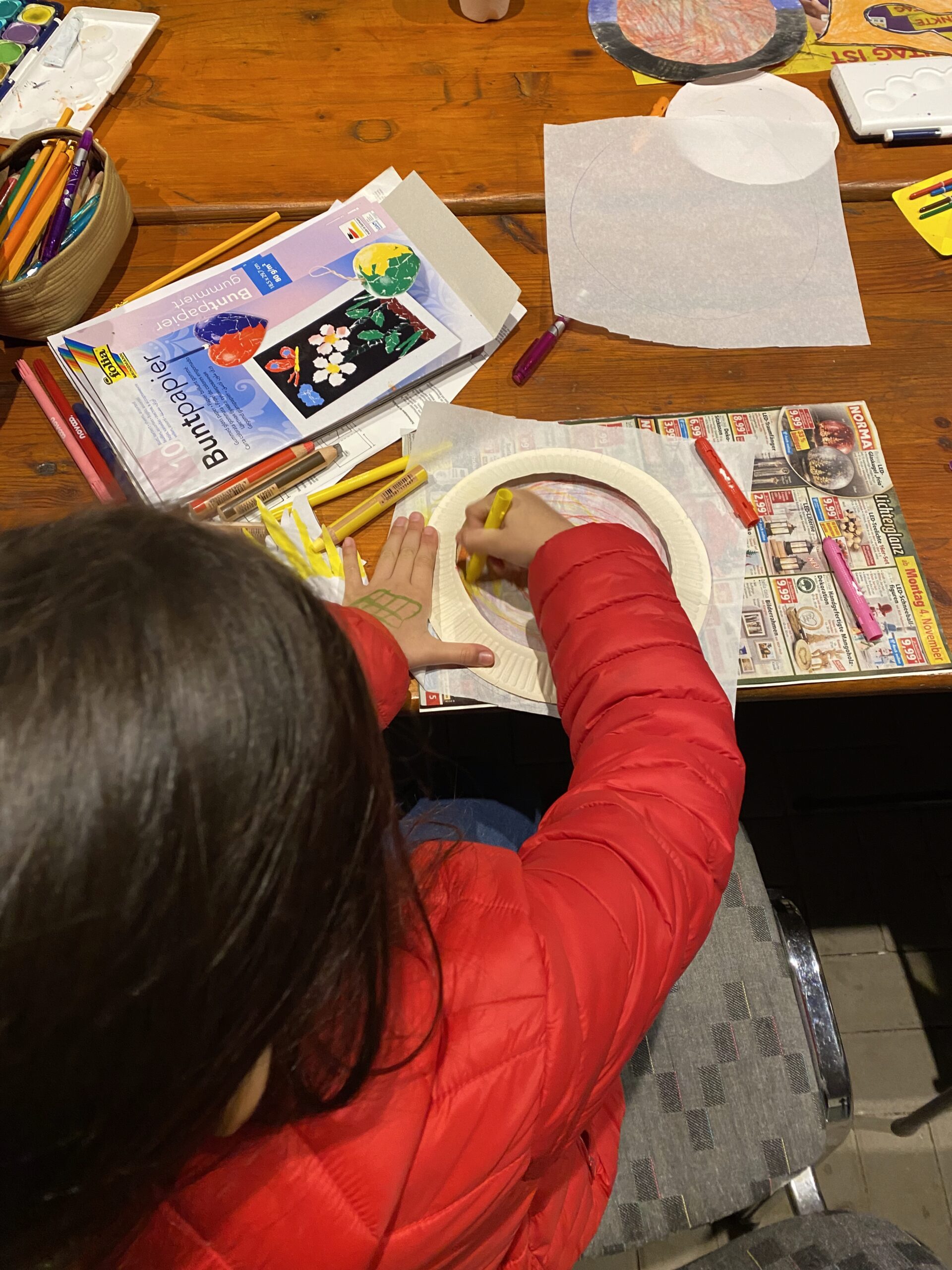 Vor zwei Wochen haben wir zusammen mit den Kids die süßesten Laternen gebastelt! Mit einfachen Materialien wie Papptellern und Butterbrotpapier haben wir echte Kunstwerke erschaffen. Die Kids haben das Papier mit Wachsmalkreide bunt bemalt, und nach dem Bügeln kam dieser tolle, durchscheinende Effekt zum Vorschein – ein echter Hingucker!